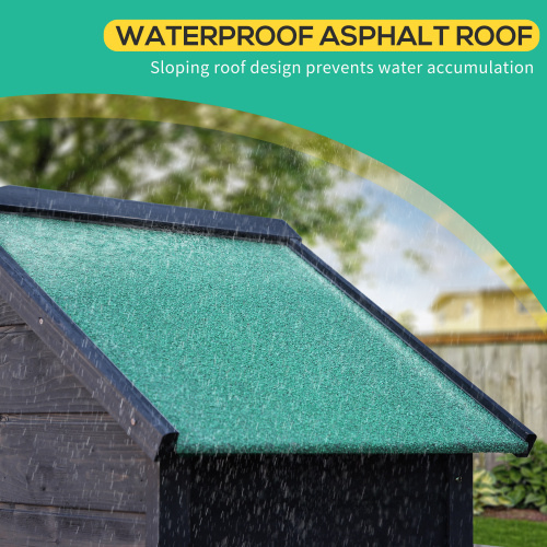 • Fir wood structure, with asphalt roof: A strong structure, with a weather-resistant paint coating - suitable for outdoor use. Sloped roof to prevent water build up, with a covering to help stop liquids seeping through.